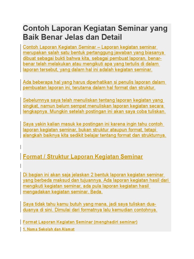 Contoh Laporan Hasil Seminar. Puji syukur penulis panjatkan kehadirat allah swt. (a)pembukaan, (b)sambutan kepala sekolah dan / atau pengawas sekolah, (c) pemaparan singkat laporan hasil penelitian oleh penyaji/ penulis laporan, (d)tanggapan, pertanyaan, kritik/ saran, masukan dari peserta seminar dan tanggapan dari penyaji, (e)penutup. Dalam laporan seminar ini, kami telah berusaha semaksimal mungkin untuk menyusun laporan ini dengan sesempurna mungkin, namun pada kenyataannya banyak terdapat kekurangan dan kesalahan. Jagir, buat orang surabaya pasti tau jalan ini.