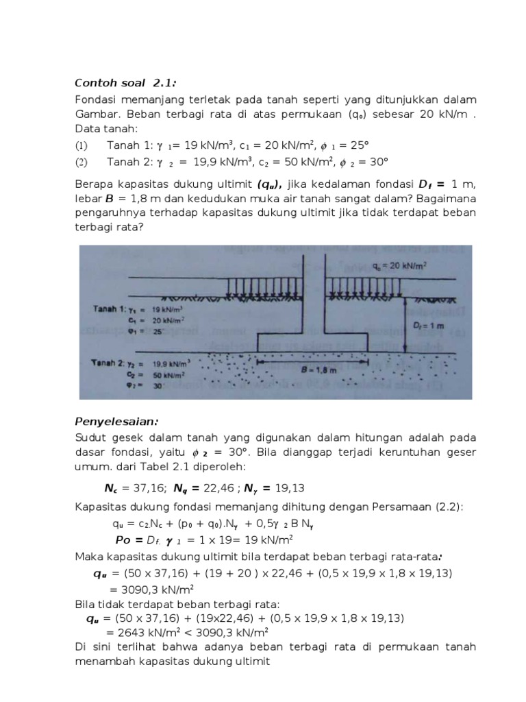 Q pelat pondasi = 0,3 × 2.4 = 0.72 t q tanah = 1.2 × 1.6 = 1.92 t q total = 0.72 + 1.92 = 2.64 t 3. Dengan tahapan perhitungan sebagai berikut: Tekanan pada dasar fondasi bangunan total adalah 110 kn/m2. Dasar fondasi pada kedalaman 3 m, dan tanah dibawah fondasi berupa lempung tidak homogen setebal 28.5 m yang terletak pada lapis pasirberkerikil sangat padat.variasi koefisien bhl h l. Orang awam sering menyebutnya pondasi cakar ayam, padahal ini bukan pondasi cakar ayam.